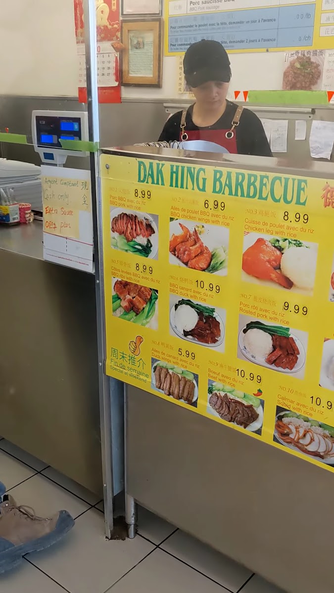 Dak Hing Barbecue is a no-frills Chinese barbecue spot tucked into a small storefront on Avenue Van Horne, just a short walk from Plamondon Metro station. Its unassuming appearance belies a focus on straightforward, well-executed Cantonese-style roasted meats. This is the kind of place where you come for a quick, flavorful meal rather than a traditional sit-down dinner experience — many locals grab their favorites to go, or enjoy their order on the nearby bench outside.